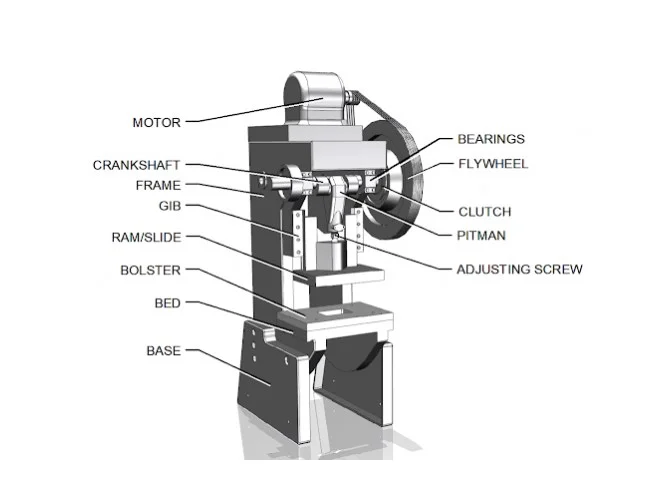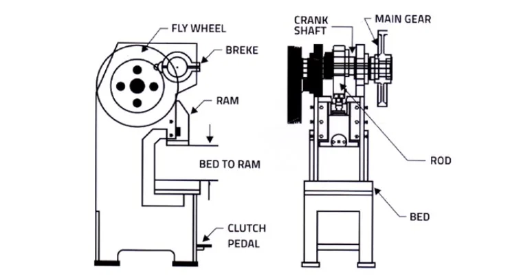 The ram and bed of the Power Press Machine are equipped with combination dies to shape metal sheets. A motor powers the rotation of the flywheel, which connects to the crankshaft through a clutch. The crankshaft converts the flywheel’s rotational motion into the ram’s upward and downward motion.